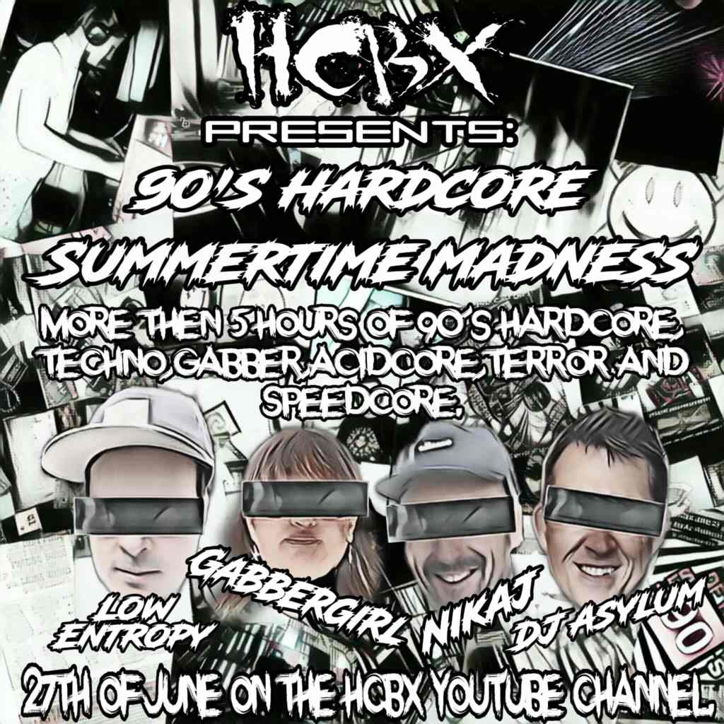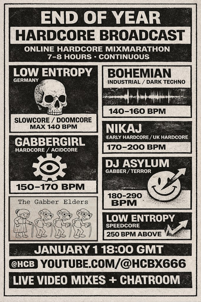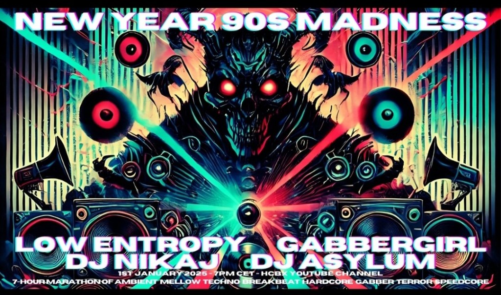 The first Mixmarathon occurred on January 1st, 2025 on HCBX, and was spun by NIKAJ (Netherlands), Low Entropy (Germany), DJ Asylum (Scotland), and GabberGirl (USA). It was a live premier event equipped with a chat room which was quickly renamed the Banter Room. It lasted more than six and a half hours, and was called the ‘New Year’s 90’s Madness Mixmarathon’. The theme was all 90’s tracks, starting with an hour of ambient (Low Entropy), moving into techno and acid (NIKAJ). Hardcore techno and hard acid were next (DJ Asylum), followed by gabber (NIKAJ), then terror, finally ending in speedcore (GabberGirl).