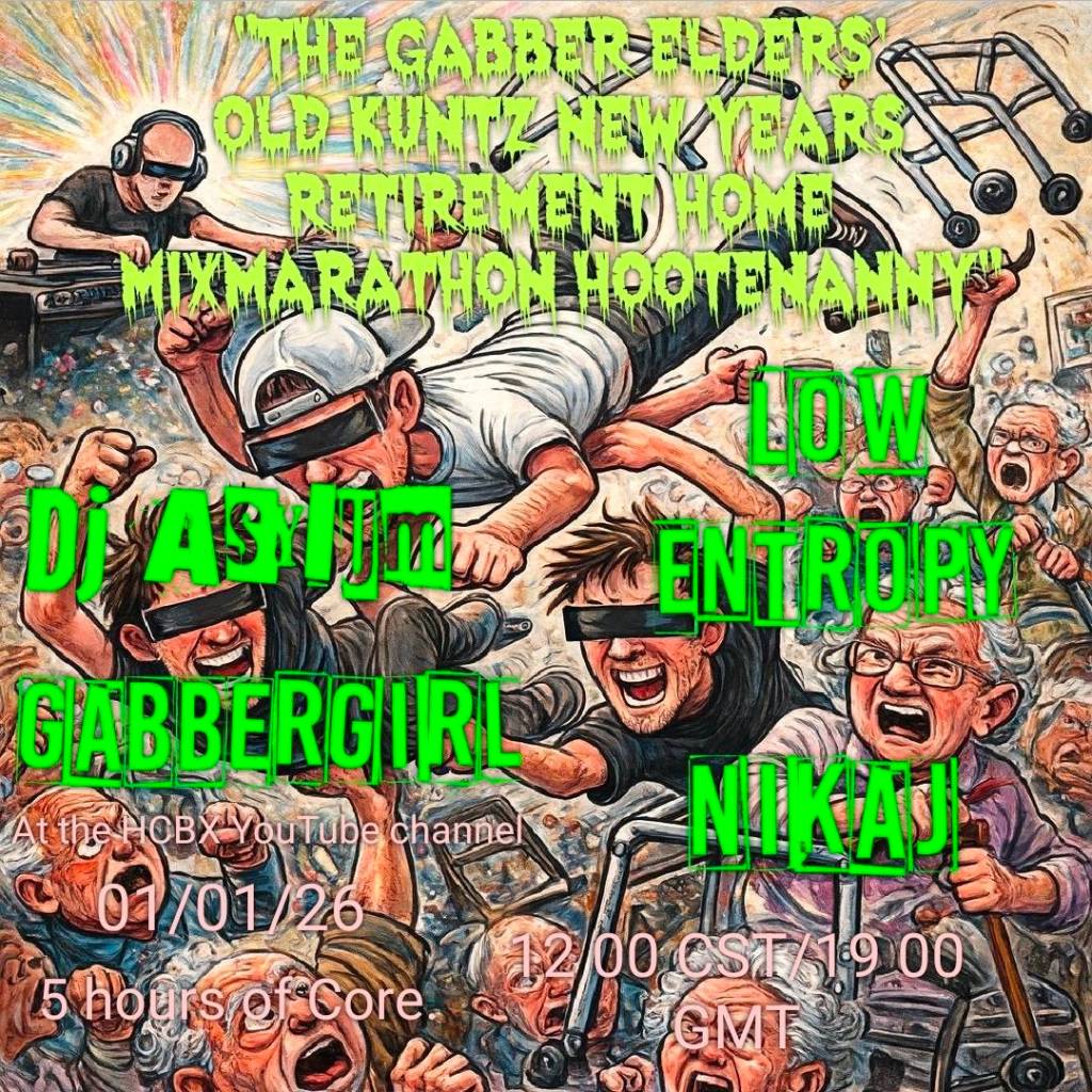 Listeners of ‘The Gabber Elder’s Old Kuntz New Year’s Retirement Home Mixmarathon Hootenanny’ enjoyed an hour of Slowcore/Doomcore/Industrial (Low Entropy), an hour of Dark Techno/Darkcore (Bohemian), 90 minutes of Hardcore Techno/Hard Acid (GabberGirl), 90 minutes of UK Hardcore/Millenium Hardcore/Breakcore (NIKAJ), two hours of Hardcore/Gabber/Terror (DJ Asylum), ending with 30 minutes of Speedcore (Low Entropy). All stitched together perfectly with knitting needles and ball of yarn, spun expertly by old people.